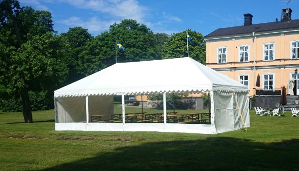 Vårat största tält i partytält serien! Här finns plats för upp till 60 gäster med bord och stolar. Med bänkset ryms upp till 96 personer vid lite tätare sittning.